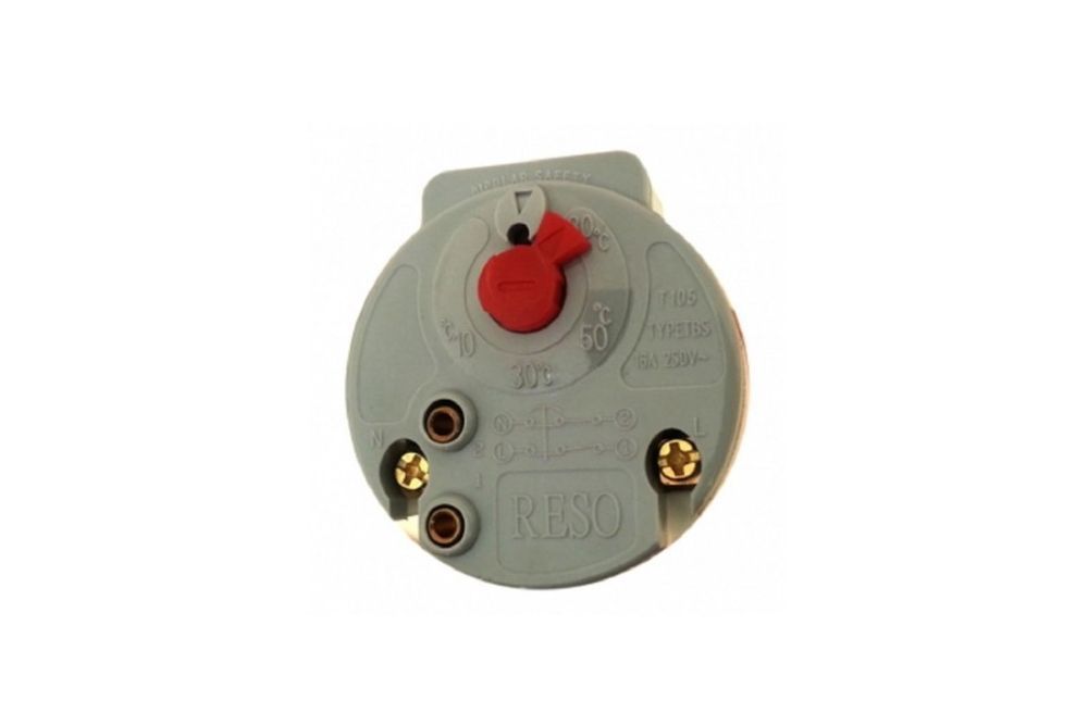 Это реле выполняет функцию термопредохранителя. Устройство имеет заводскую калибровку срабатывания при нагреве воды до 80 °C. Если контакты термостата залипли и не отключились при достижении максимально предусмотренной температуры, а нагрев воды продолжается, то срабатывает термозащита. При этом контакты термозащитного реле не замыкаются обратно после остывания воды, поэтому водонагреватель перестает включаться. Чтобы восстановить его работу, реле придется включить вручную, нажав на кнопку.