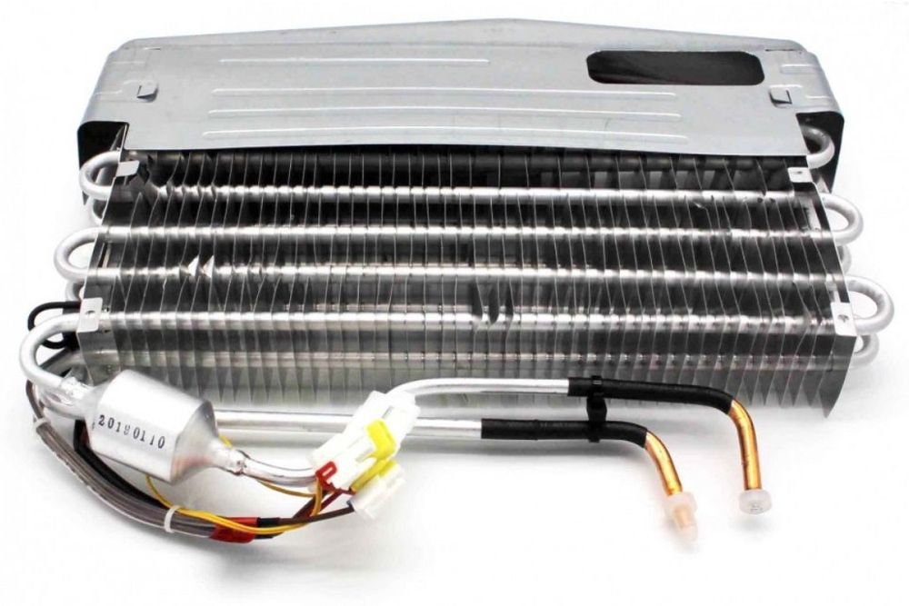 Испаритель в холодильнике установлен для поглощения теплого воздуха внутри камеры и преобразования хладагента из жидкого состояния в газообразное. Благодаря этому процессу в агрегате происходит генерация холода. Когда фреон превращается в пар, тепловая энергия поглощается. Хладагент поступает в компрессор, далее передается в конденсатор. Теплый воздух вступает в контакт с трубками, охлаждается и спускается вниз. Узел состоит из алюминиевых трубок (по которым течет фреон) и термодатчиков. В системах No Frost конструкция дополняется ТЭНом и таймером.